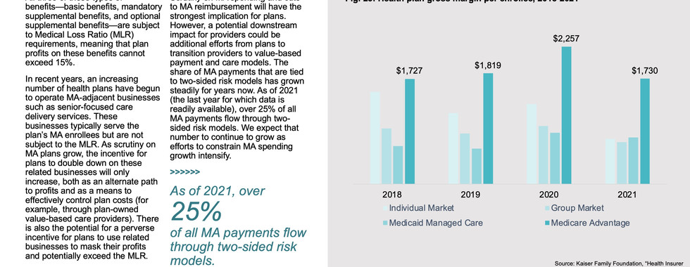In recent years, an increasing number of health plans have begun to operate MA-adjacent businesses such as senior-focused care delivery services. These businesses typically serve the plan’s MA enrollees but are not subject to the MLR. As scrutiny on MA plans grow, the incentive for plans to double down on these related businesses will only increase, both as an alternate path to profits and as a means to effectively control plan costs (for example, through plan-owned value-based care providers). There is also the potential for a perverse incentive for plans to use related businesses to mask their profits and potentially exceed the MLR.